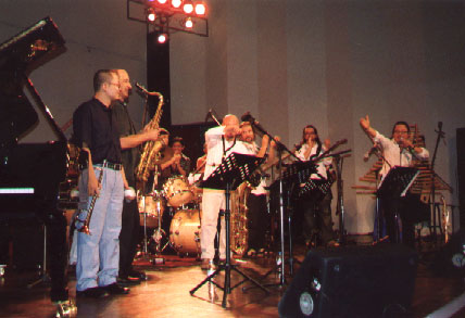 | C'est là que pendant plusieurs jours, nous nous sommes retrouvés pour mélanger nos deux formations musicales. Nous avons ainsi mixés les répertoires et les musiciens. | |