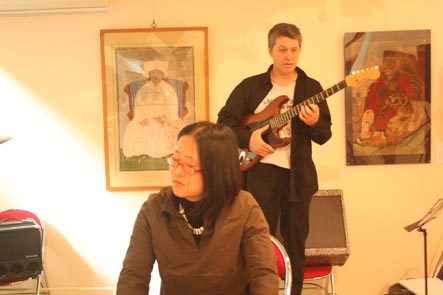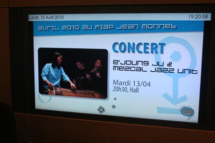 13 avril: concert avec Joung Ju, au FIAP, Paris Le FIAP est un centre de séjour international . Nous y faisons un concert dans le hall d'accueil. Les conditions ne sont pas idéales comme dans tout concert gratuit dans un lieu de passage, mais le public présent et installé apprécie. |