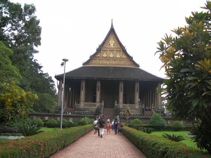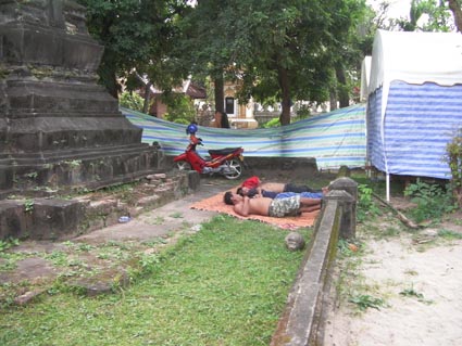Days off06 novembre 2011Depuis quelques jours, on entend de la musique dans la rue d'à coté.Nous décidons hier après midi d'aller voir. C'est une maison de musiciens, ils jouent quasiment dans la rue. Sans rien nous demander, on nous installe des chaises et la répet continue, sans s'occuper de nous le moins du monde.Le lendemain matin, c'est vers 7h que ça recommencera,les basses faisant vibrer les extracteurs de la clim. Ce matin, Khamsouane et Khampeng nous emmenent hors de la ville dans une école de musique de village. Khamsouane en est l'unique professeur. Il y a peu de moyens, mais les instruments sont bons (on nous glisse à l'oreille qu'elle serait soutenue par la maitresse d'un haut personnage de l'état, mais ...cela ne nous regarde pas...) Les enfants de 6 à 12 ans y viennent le week end et pendant les vacances. Sorte de centre aéré musical. Il y a aussi un terrain de foot. Nous avons droit à une concert et une danse des filles accompagnées par les garçons aux instruments. Puis nous serons invités à improviser nous même sur les instruments traditionnels, pendant que les enfants nous regarderont, hilares. Ensuite, shopping et visite de temples. |