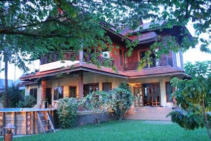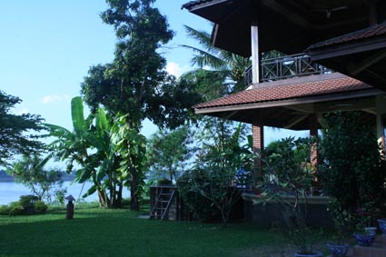 Samedi au bord du Mekong30 octobre 2011Cette journée du samedi nous la passons chez Jean Pierre et Elisabeth.Jean Pierre est non pas attaché culturel mais directeur du centre de langues et Conseiller du service de coopération et d'action Culturelle. Ils nous reçoivent dans leur villa qui est une grande bâtisse en bois, magnifique surplombant la berge du Mekong. De l'autre côté du fleuve, la Thaïlande, dont on entend les échos d'une fête dans la petite ville côtière d'en face. De ce coté ci, une république populaire communiste, de l'autre, une monarchie. La traversée est bien sûr interdite. Les thais et les laos se comprennent, les 2 langues sont proches (ce n'est pas le cas avec le Vietnam ou le Cambodge qui ont des langues très différentes). D'ailleurs, lors de l'instauration du communisme en 75, une bonne partie des classes aisées et éduquées a traversée le fleuve privant le pays d'une grande partie de son intelligentsia, saignée dont on ressent encore les effets aujourd'hui. (8% de la population a fui dans les 3 premières années, soit 8 fois plus qu'au Vietnam).