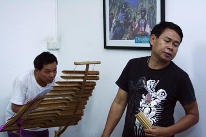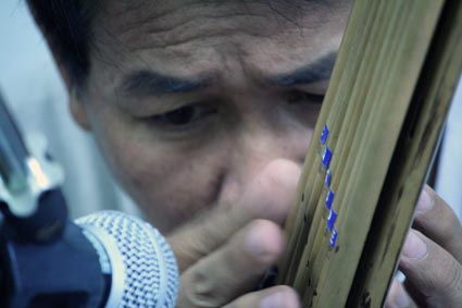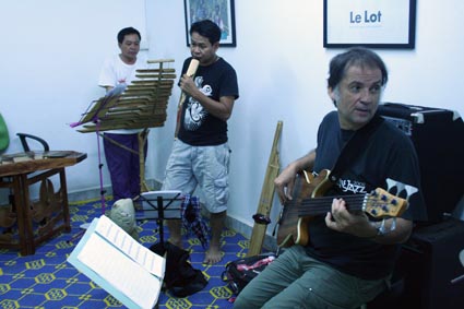 Dernières répétitions05 novembre 2011Nous faisons le matin du concert (vendredi) une ultime scéance de répétitions et d'enregistrement, dans une petite salle de classe, car la salle où nous répétions jusque là a été louée pour un colloque de 2 jours. Depuis que nous avons acheté ce Khène neuf, ça va mieux. Jouer faux est particulièrement fatiguant, nerveusement. Je mettrai plus tard les photos du concert du soir. Merci aux rares personnes qui commentent le blog. Mention spéciale pour Monsieur Ma (on arrive, on arrive, sors la vodka!). |