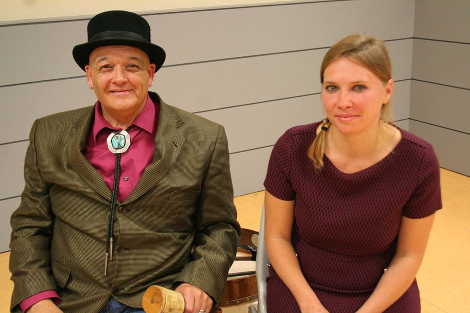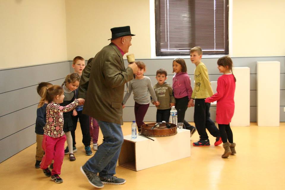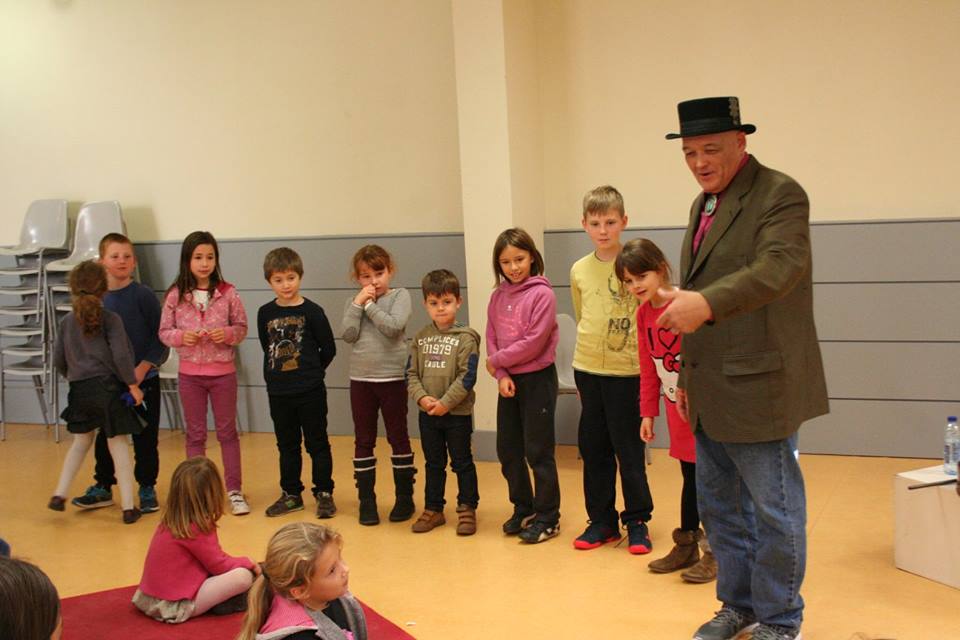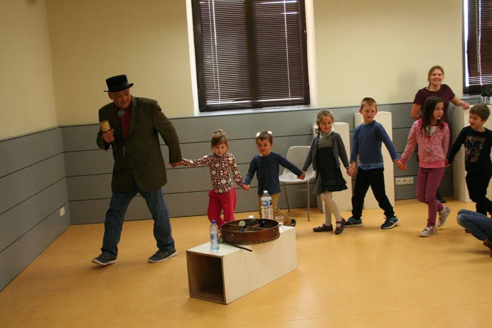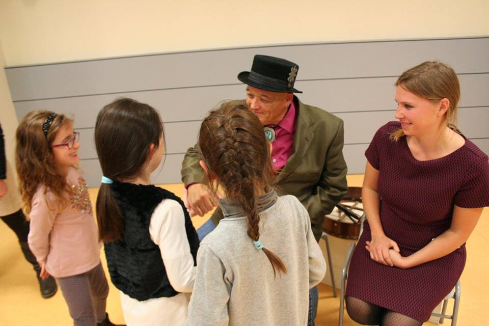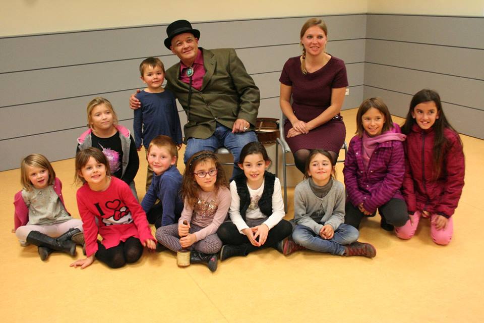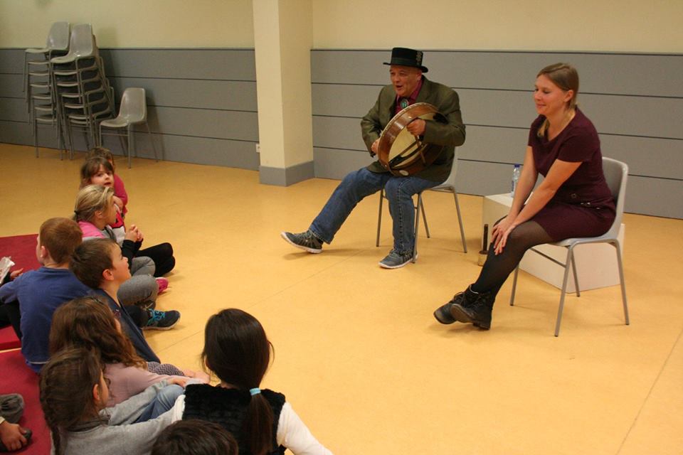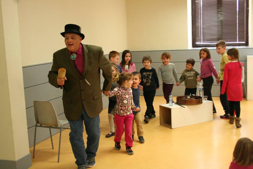 Séance de conte auprès de enfants à la Médiathèque de CauxEmily Moroney traduit en français les histoires incroyables que raconte Grayhawk, qui lui viennent de ses ancètres amérindiens.Et puis on danse au son du Rattle que seccoue Grayhawk pour donner le rythme.