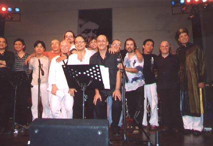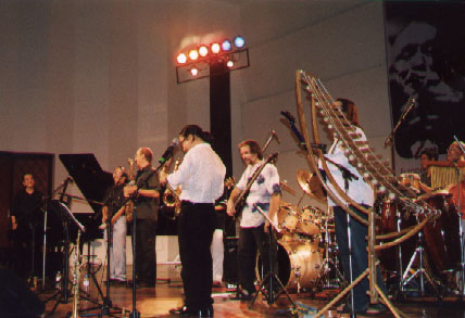 | C'est là que pendant plusieurs jours, nous nous sommes retrouvés pour mélanger nos deux formations musicales. Nous avons ainsi mixés les répertoires et les musiciens. | |